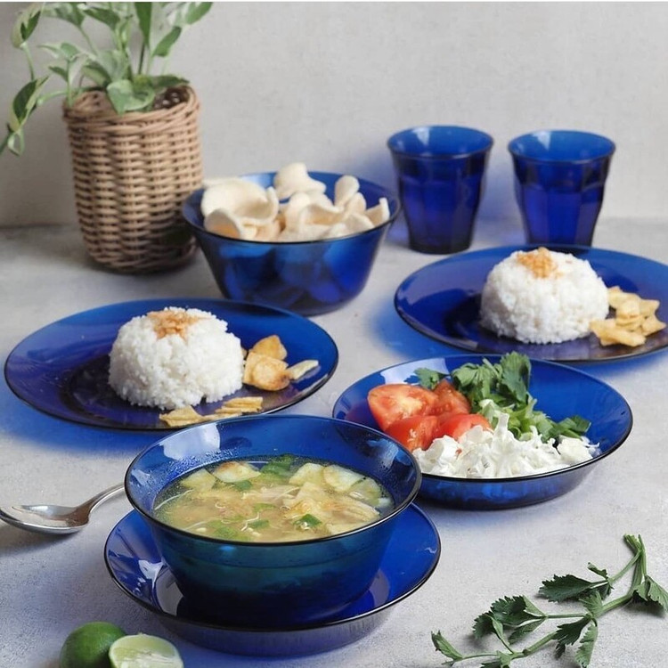 سرویس 44 پارچه آبی کاربنی فرانسوی مارک دورالکس فرانسه وکیوم و آکبند 6 بشقاب پلویی 6 بشقاب خورشتی 6 پیش دستی 6پیاله 6لیوان دسته دار 6فنجان 6نعلبکی 1 کاسه بزرگ سالادی قطر23 1کاسه آبگوشتی قطر 17