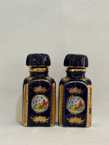 تنگ و جام پایه دار قدیمی آبی نقاشی دست با طلاکوب عالی